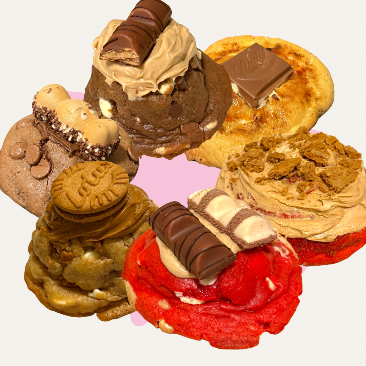 Kies uit Cookies, Cake Slices, Brownies, Cinnamon Rolls, Cookie Pie, Energy Balls, Chocolade en Cookie Dough. Combineren mogelijk.